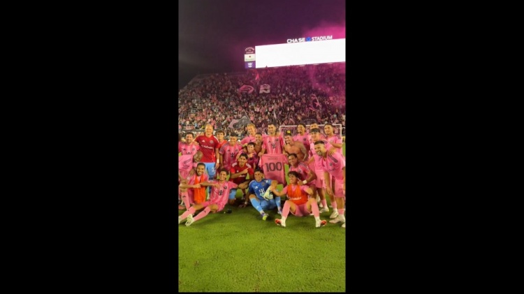 现年37岁的布斯克茨2023年加盟迈阿密国际,这位西班牙中场各项赛事已经为球队出战100场比赛,在淘汰奥兰多城的赛后,布斯克茨获赠一件纪念球衣,全队合影留念庆祝这一时刻。